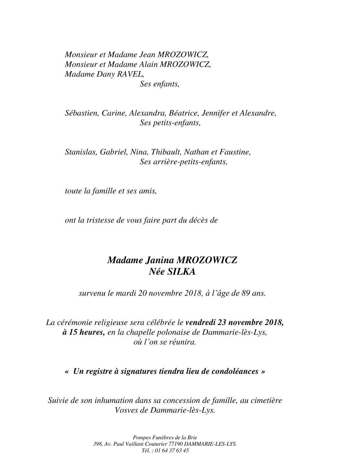 Décédée à Champcueil (91750, France) le mardi 20 novembre 2018 à l'âge de 89 ans