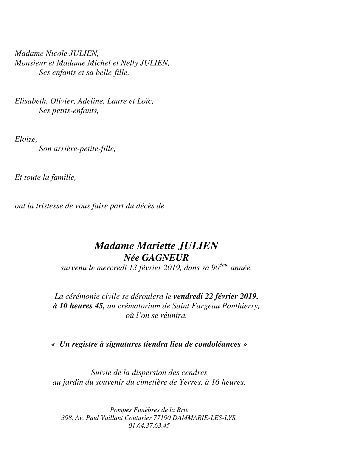 Décédée à Le Mée-sur-Seine (77350, France) le mercredi 13 février 2019 à l'âge de 89 ans