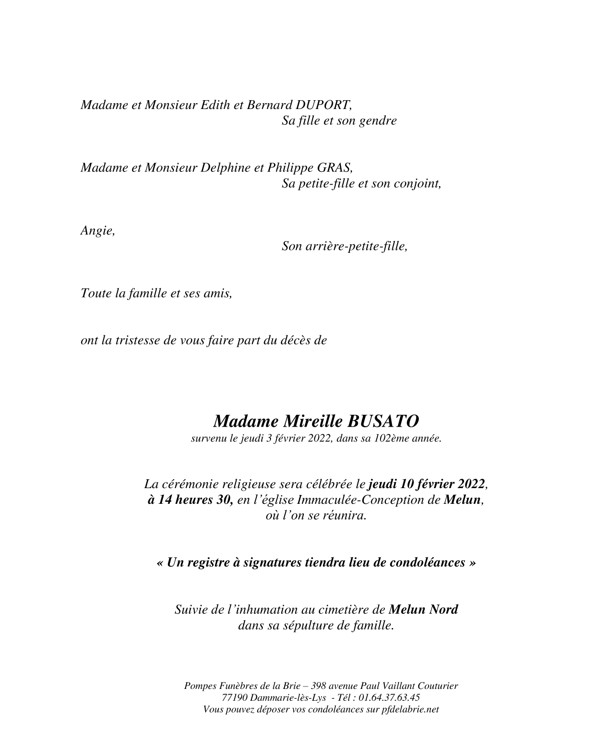 Veuve de Monsieur Aldo BUSATO