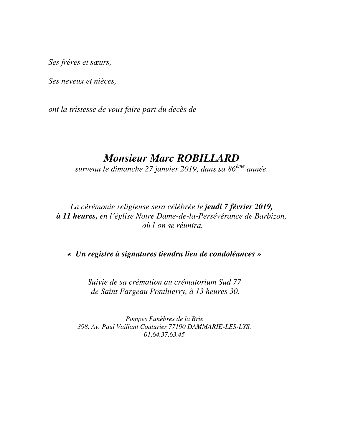 Décédé à Nemours (77140, France) le dimanche 27 janvier 2019 à l'âge de 85 ans