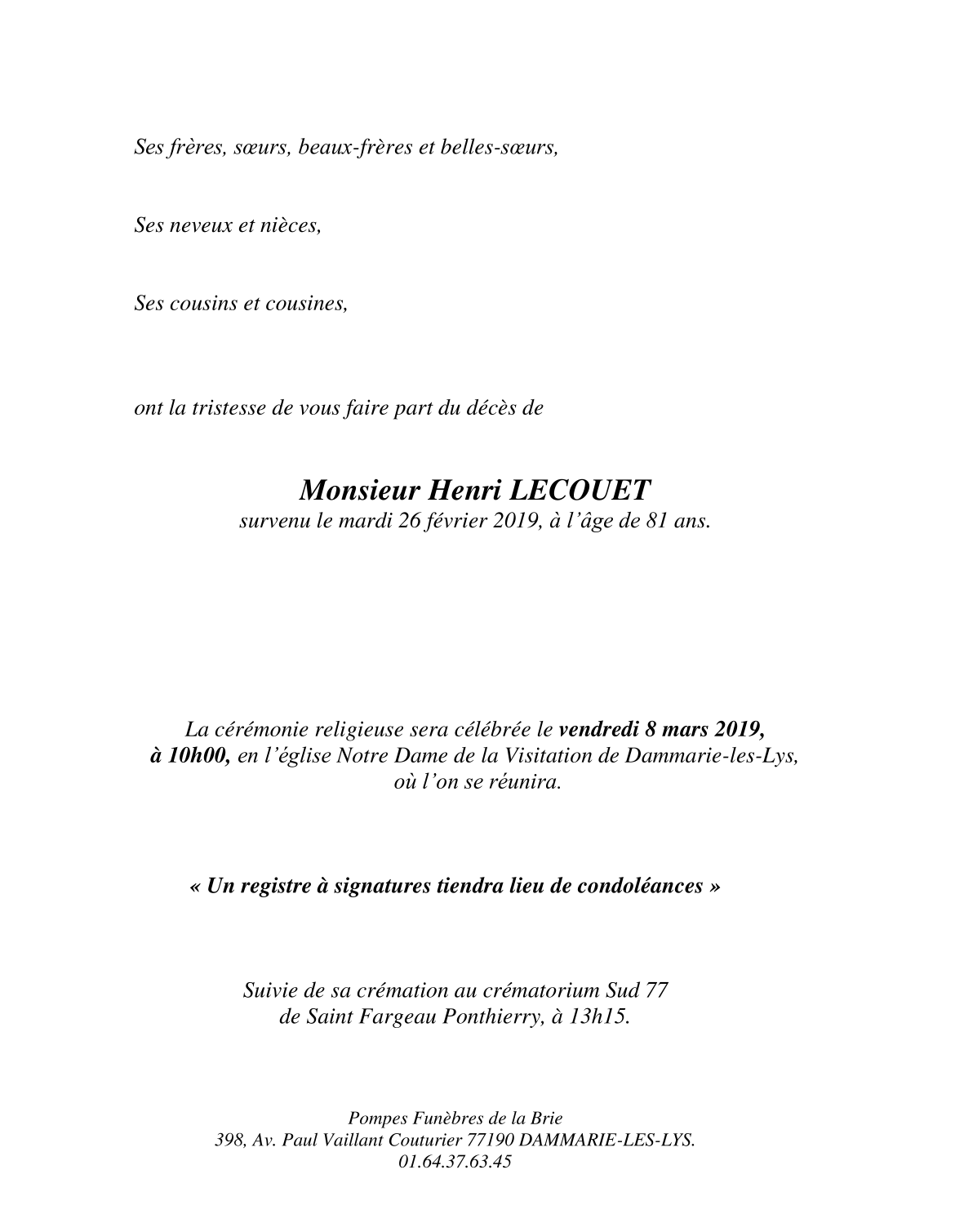 Décédé à Melun (77000, France) le mardi 26 février 2019 à l'âge de 81 ans