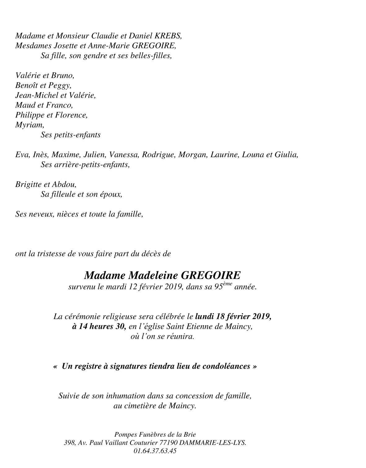 Veuve de Monsieur Alphonse, Auguste, Jean GRÉGOIRE