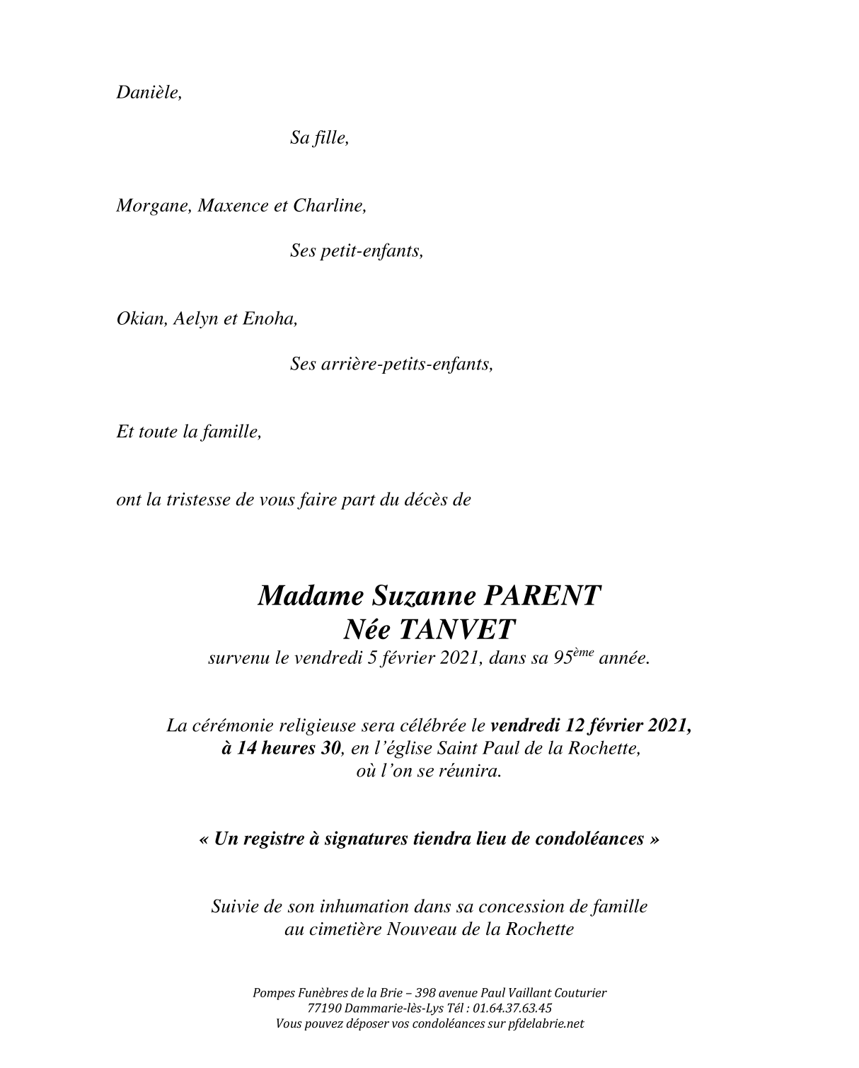 Veuve de Monsieur Claude, Philippe, Fernand PARENT