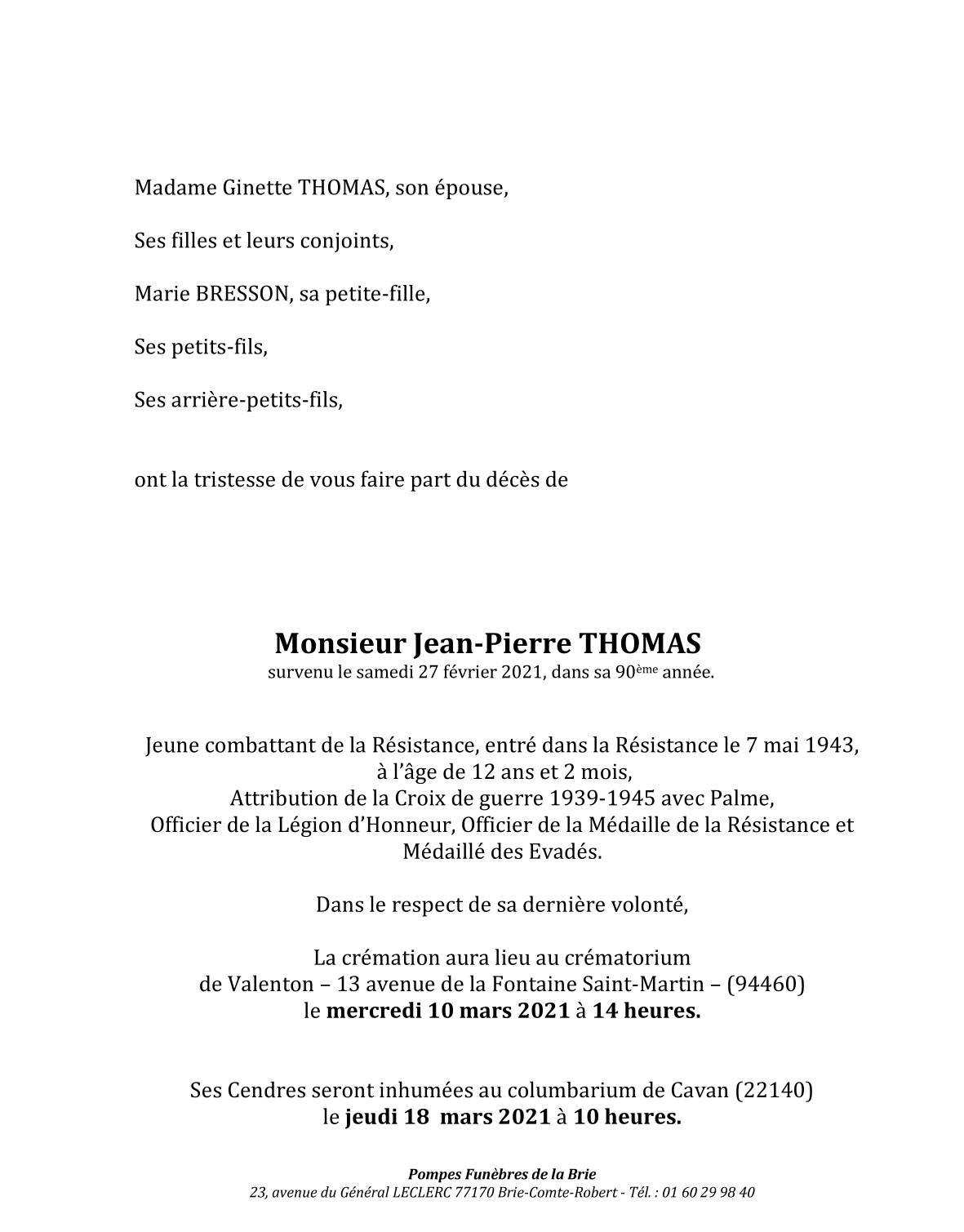 Décédé à Jossigny (77600, France) le samedi 27 février 2021 à l'âge de 89 ans